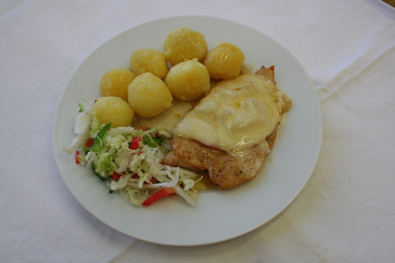 Smažený kuřecí řízek, brambor, mrkvový salát s jablky a ananasem (1,3,7)