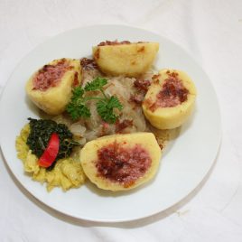 Plněné bramborové knedlíky, kysané zelí, smažená cibulka (1,3,7)